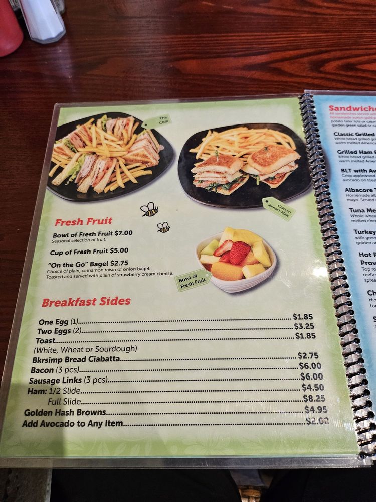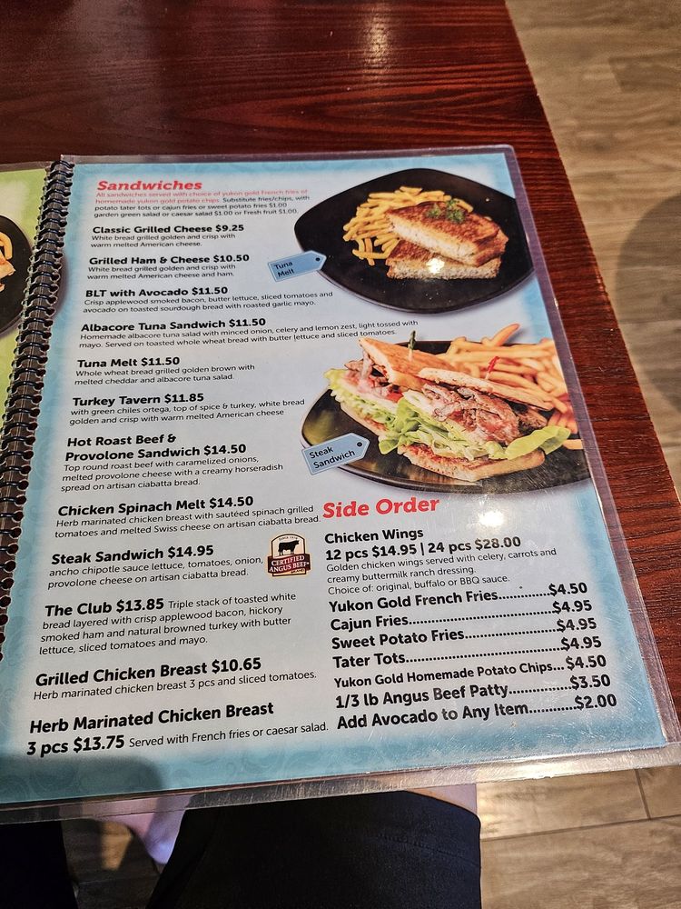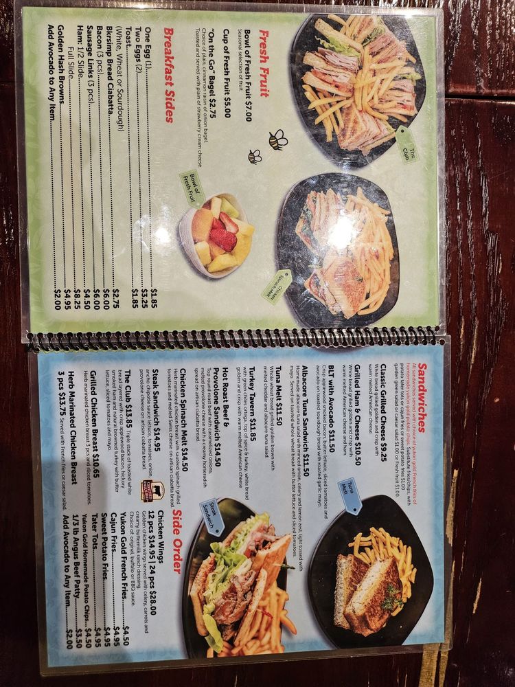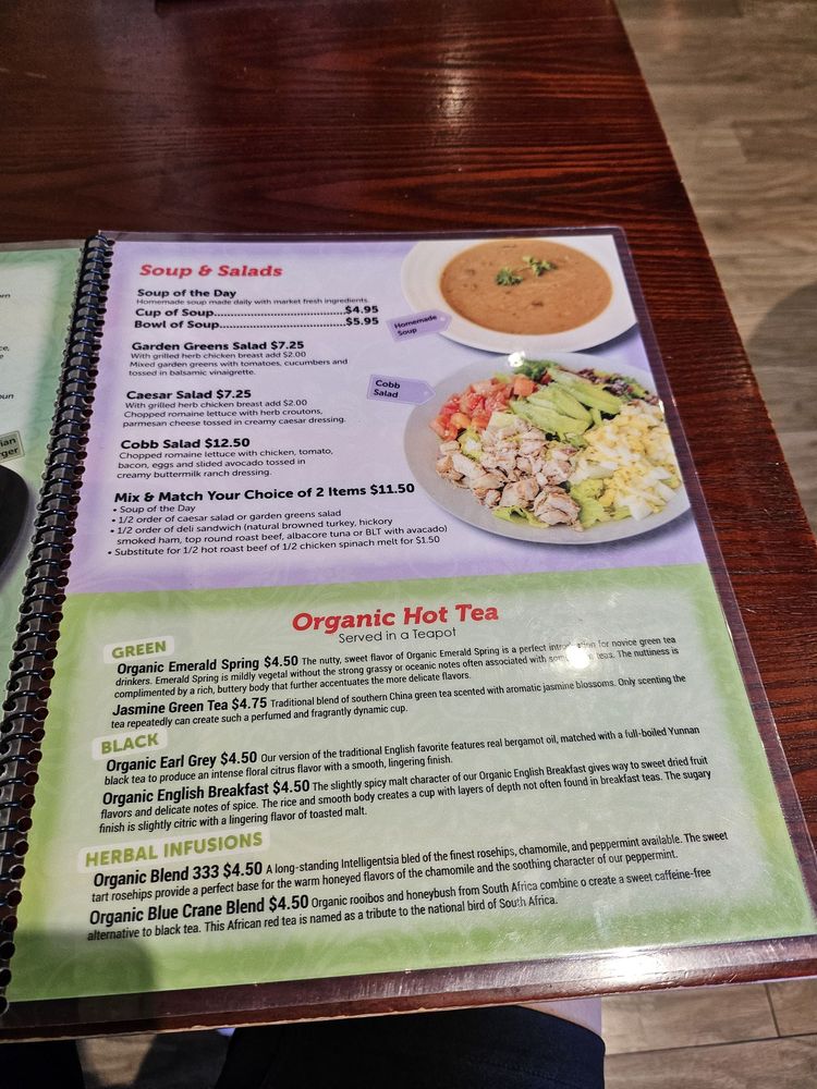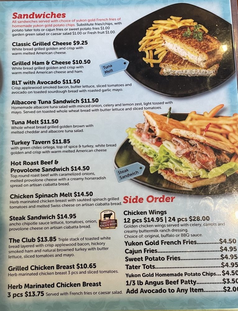 soup of the day / order of caesar salad or garden greens salad natural browned turkey, hickory smoked ham, top round roast beef, albacore tuna, or blt w/ avocado substitute / hot rast beef or / chicken spinach melt
